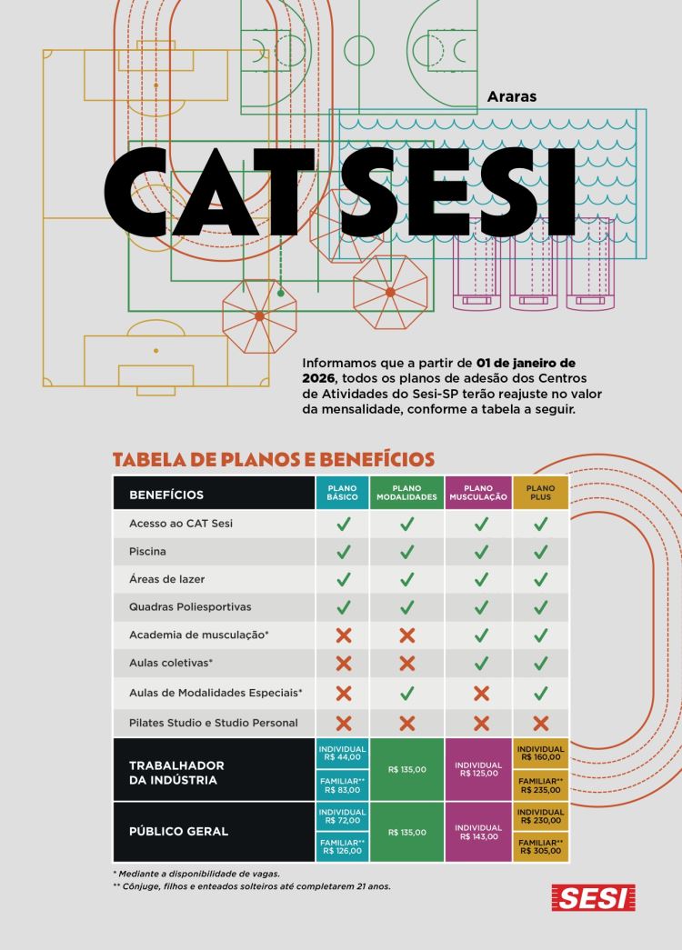 Valores dos Planos do CAT Sesi Araras a partir de 01/01/2026