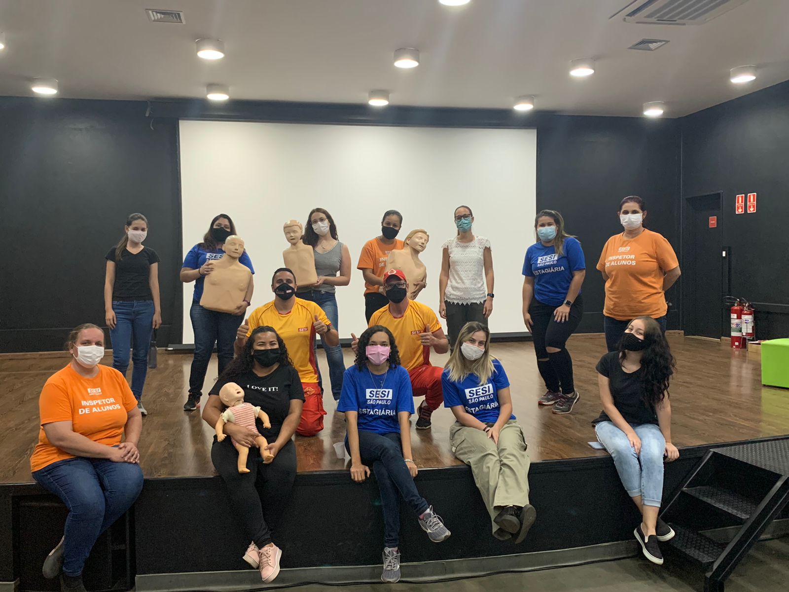 Noções Básicas de Primeiros Socorros foi tema de treinamento que estagiárias, inspetoras e cuidadora da escola Sesi de Araras tiveram na quarta-feira (15/09) com os guarda-vidas do CAT (centro de atividades) Sesi Araras, Anderson Teles, Bruno Guinther e Carlos Fabiano Trinchetti.